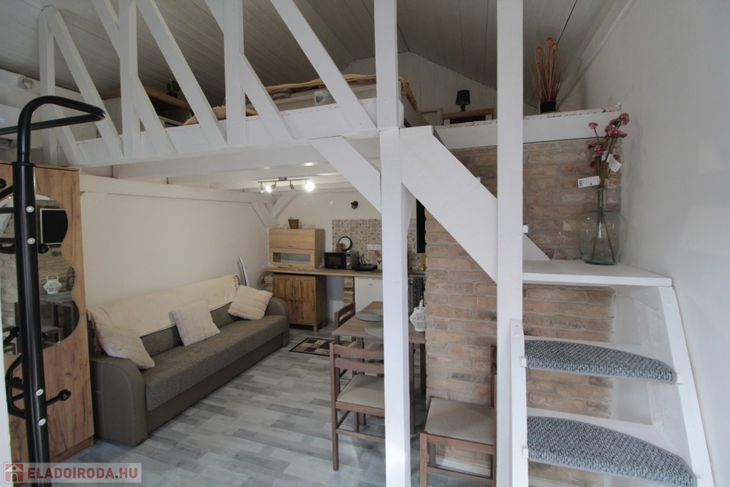 A Balaton-felvidék egyik legbájosabb településén, Badacsonytördemic macskaköves főutcáján kínálom megvételre ezt az igényesen felújított, galériás stúdió lakást.