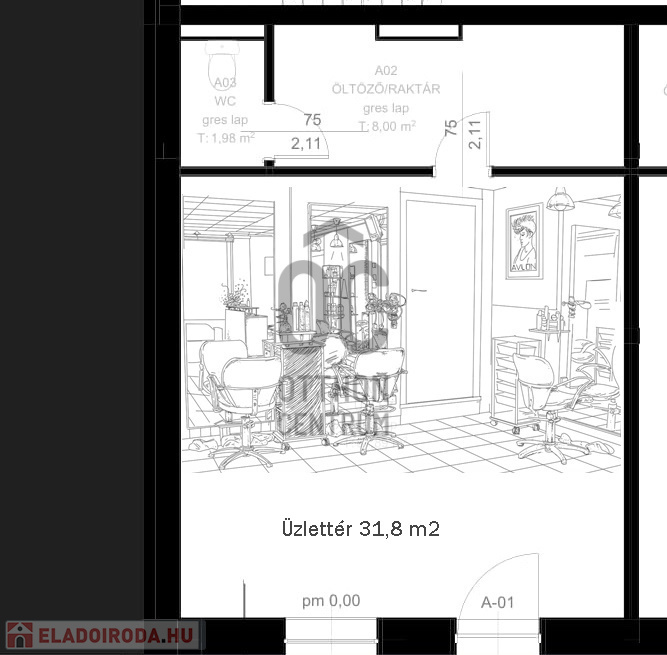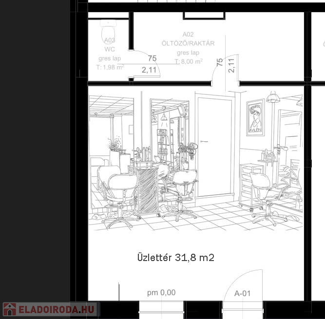 - üzlettér 31,8 m2+ kiszolgáló helyiségek