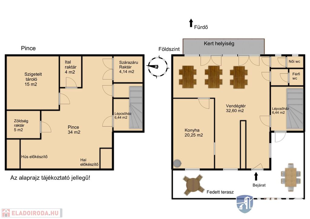 Földszint: konyha, vendégtér, bárpult, női, férfi illemhelyiség
