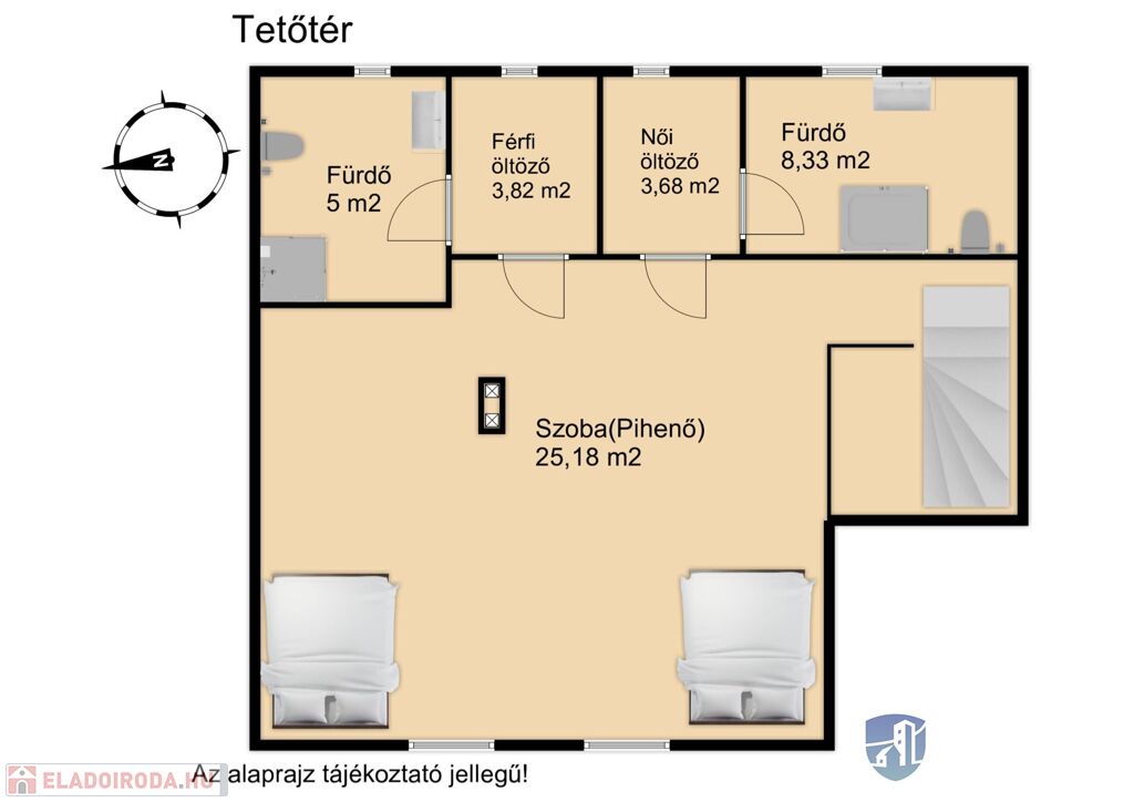 Tetőtér: szoba (pihenő), szociális helyiségek, női, férfi öltöző, 2 fürdő