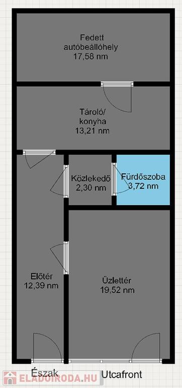 Jelenlegi elosztása alapján megtalálható benne egy 12 nm-es előtér, egy hűtő-fűtő klímával felszerelt 19,5 nm-es üzlettér, egy 3,7 nm-es fürdőszoba, egy kis közlekedő és egy jelenleg tárolóként kialakított 13 nm-es helyiség, ahol a konyhai kiállások előkészítésre kerültek, így könnyen átalakítható akár lakásnak is.