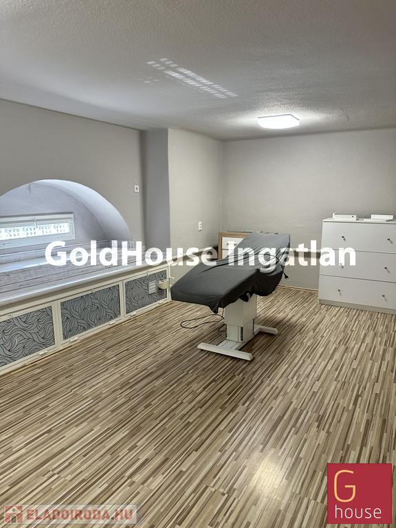 Az emeleten 5 kezelőszoba, zárható, csendes, vízzel ellátva, nagy előtér, mosási lehetőséggel.