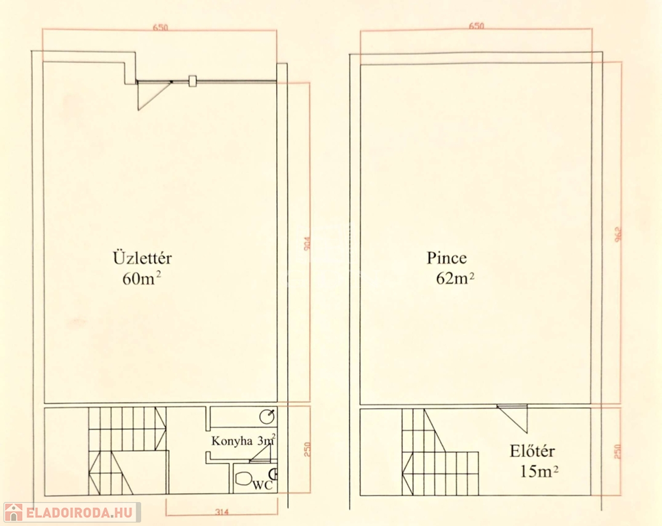 Földszint (60 m²): Utcafronti üzlettér, teakonyha, mosdó