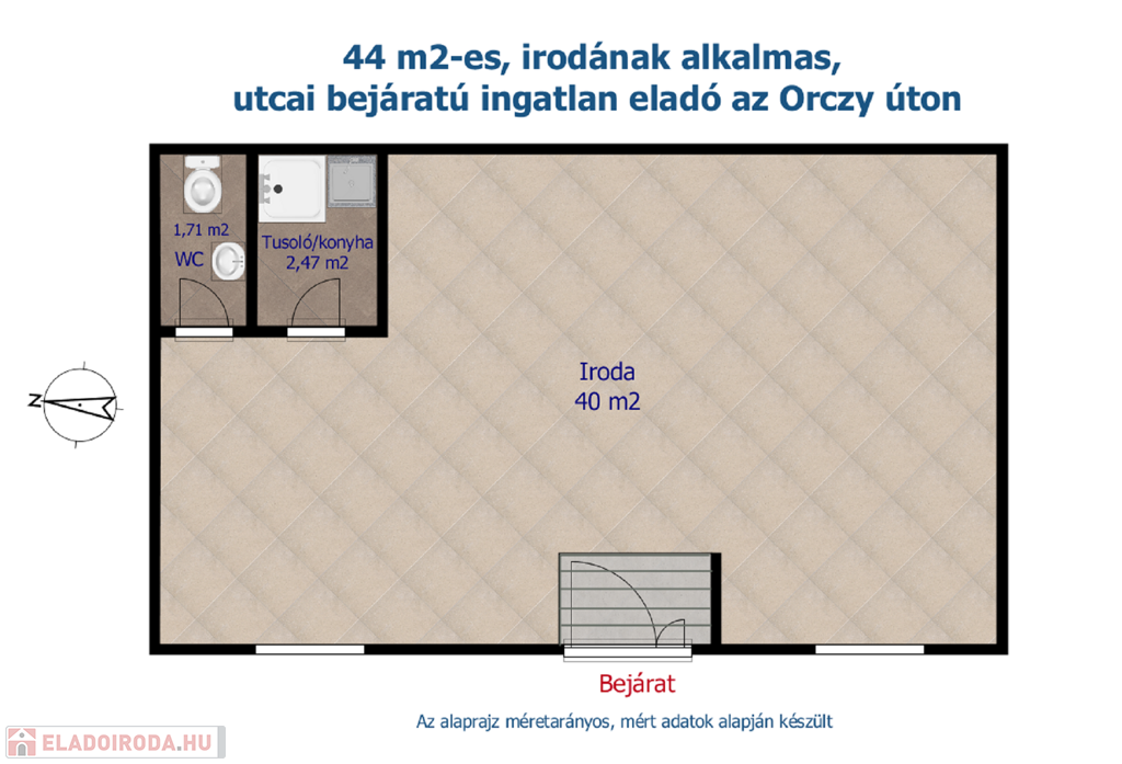 A fotók között látható alaprajz szerinti elrendezésben a 44 m2-es térből leválasztásra került egy mosdó és egy tusoló/konyha funkciót ellátó helyiség, amelyek egy iroda vagy üzlet funkcionális és higiéniai szempontjainak teljesen megfelelnek.