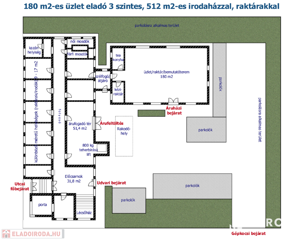 180 M2-ES ÜZLET HÁROM SZINTES, SZINTENKÉNT 512 M2-ES IRODAHÁZZAL, RAKTÁRAKKAL, PARKOLÓKKAL – STRATÉGIAI HELYEN ELADÓ