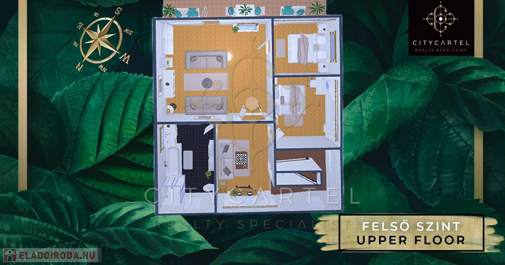 Felső szint: előtér/társalgó, 2 hálószoba, nappali, világos, ablakos fürdőszoba káddal, zuhanyzóval és WC-vel, terasz, padlásfeljáró