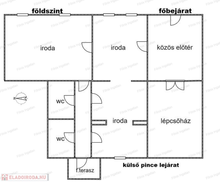Földszint: 84.5/78 m2-es hasznos alapterülettel rendelkező, jelenleg 3 fő helyiségből (közös előtér fele, 31 m2 oktató, 12, 21 m2-es iroda helyiségek) és 2 db zuhanyzós mellékhelyiségből, illetve 5 m2 fedett teraszból áll. Innen közelíthetjük meg a hátsó zöld teraszt és a külső kerti tárolót is. Az itt található helyiségek esztétikai korszerűsítést igényelnek.