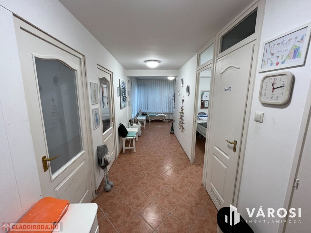 A helyiség praktikus elrendezéssel rendelkezik, három kezelőhelyiséggel, váróval, három mosdóval, teakonyhával minden igényt kielégít.