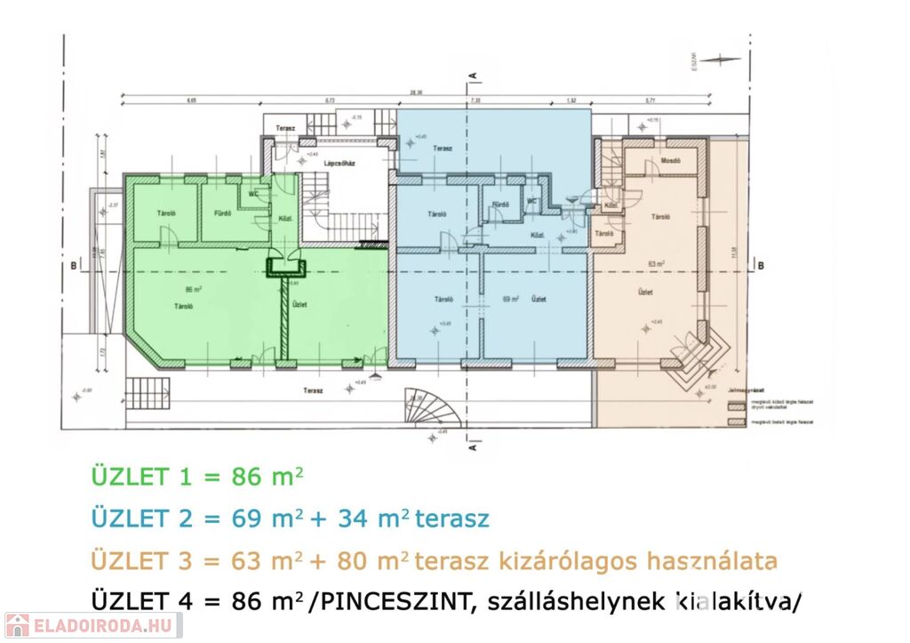 - Földszint = 3 db utcafrontos üzlethelyiség teraszokkal (86 m2 + 69 m2 +63 m2)