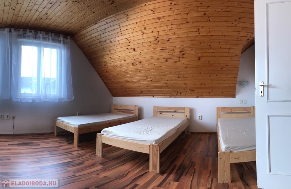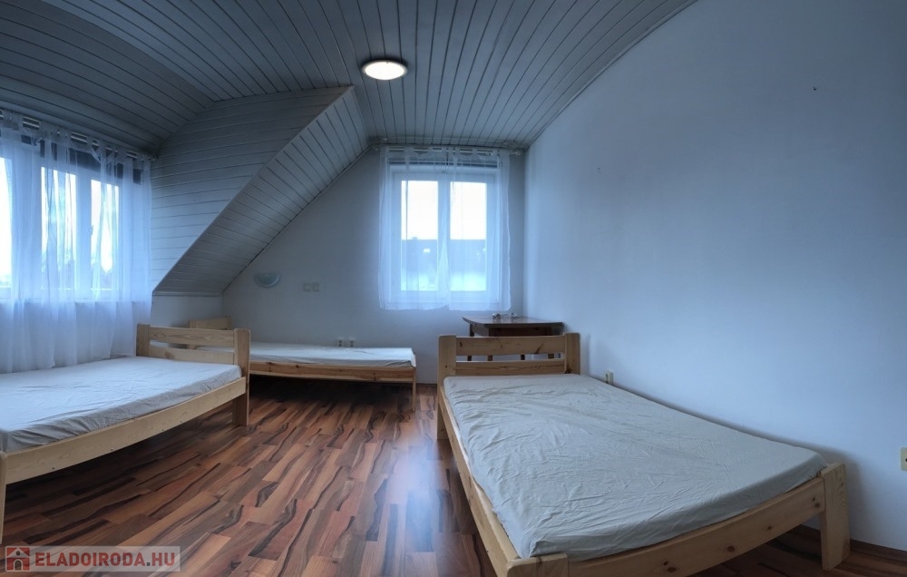 Győr-Likócs természet közeli, családi házas nyugodt övezetében, AUDI gyártól, Ipari Parktól, Belvárostól, M1-es autópályától pár perces autótávolságra, 2.100 m2-es összközműves telken lévő 2 szintes, jó állapotú épületben, összesen 9 db külön bejárattal rendelkező (10 m2; 14 m2; 17 m2, 19 m2, 20 m2 nagyságú) hálószobákból, 3 db fürdőszoba + WC-ből, méretes nappaliból/társalgóból/közösségi térből (54 m2), különálló konyhából, méretes étkezőből (17 m2), különálló kamrából, 35 m2-es TERASZBÓL, különálló pincetárolóból álló, valamint több KLÍMÁVAL felszerelt, 336 m2 hasznos alapterületű panzió/családi ház eladó.