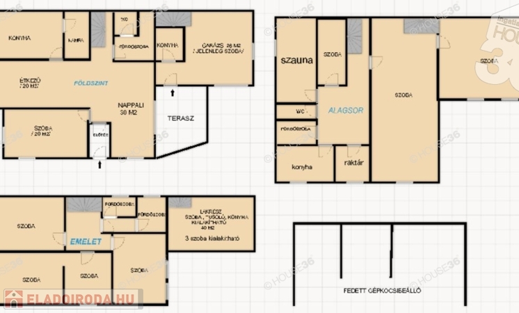 161 m2-es földszint, brutto 90 m2 emelet, 140 m2 alagsor