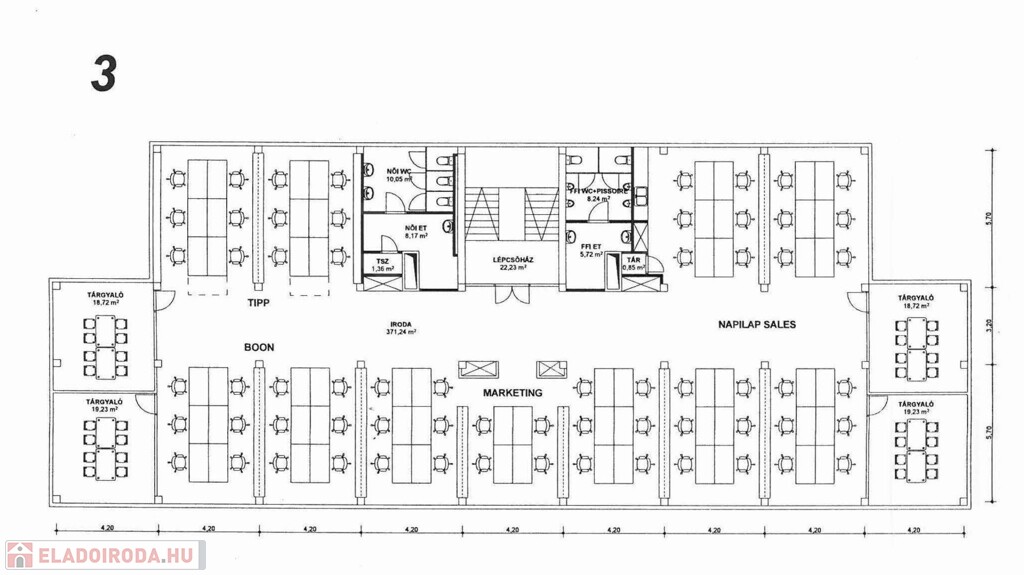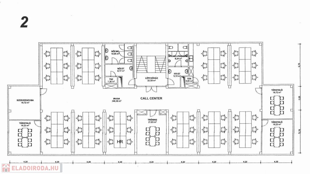 Alapterülete tulajdoni lap szerint 506 m², ezen a területen kialakított irodák összes hasznos alapterülete 2591 m².