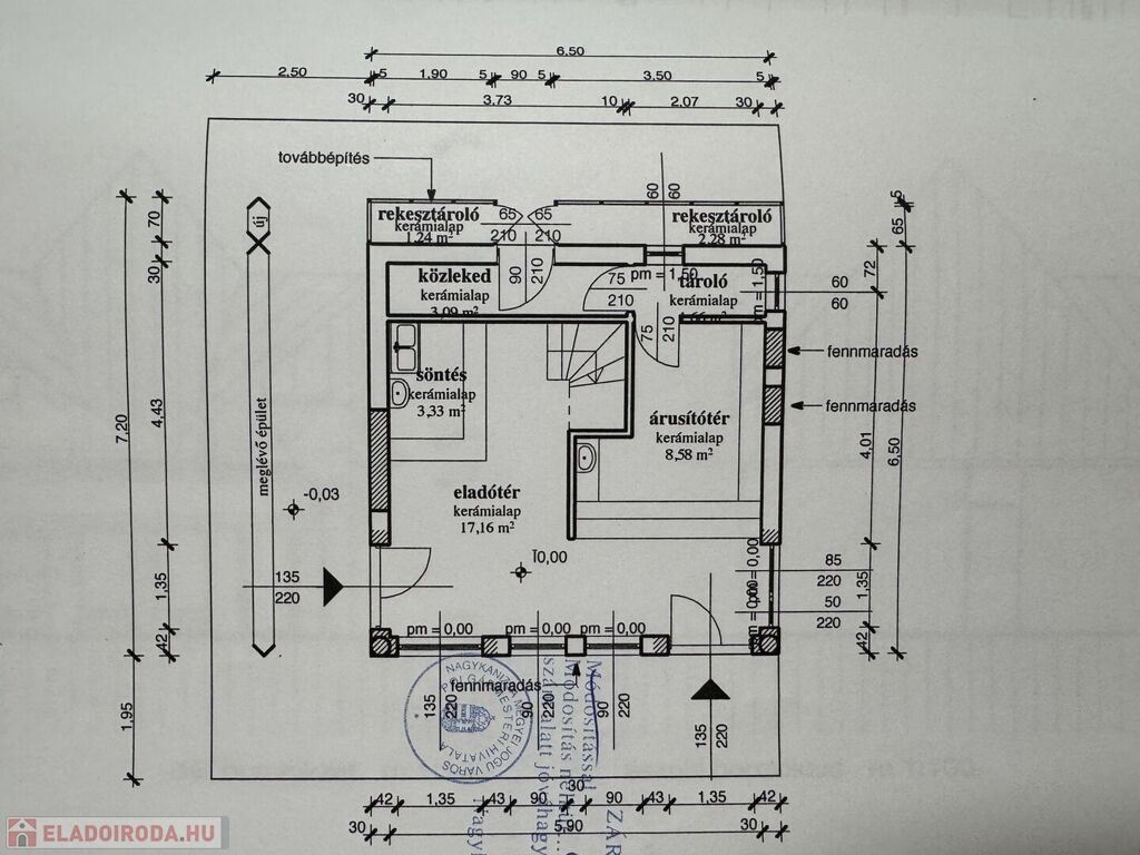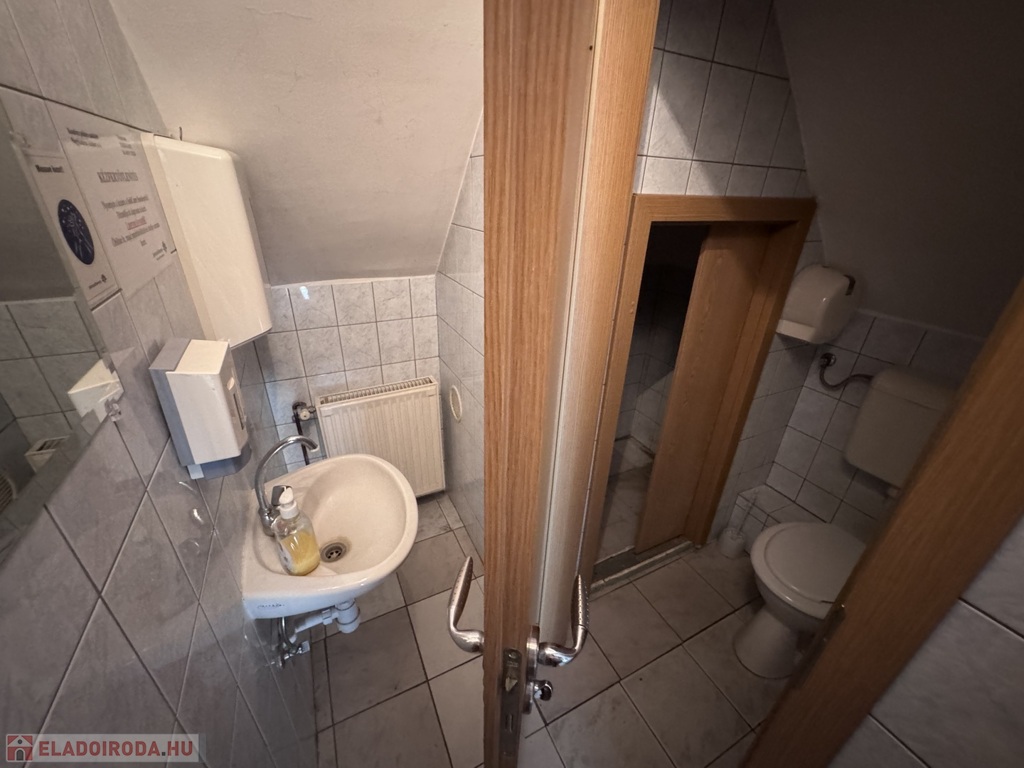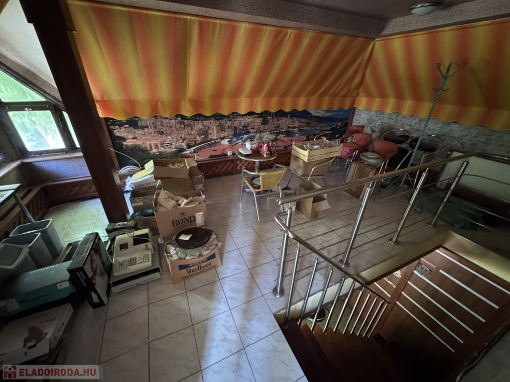 Helyiségek: eladótér, árusítótér, kiszolgálótér, 2 raktár, tetőtérben kiszolgálótér, 2 külön Wc mosdóval, tároló.