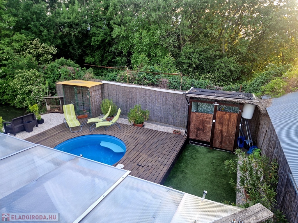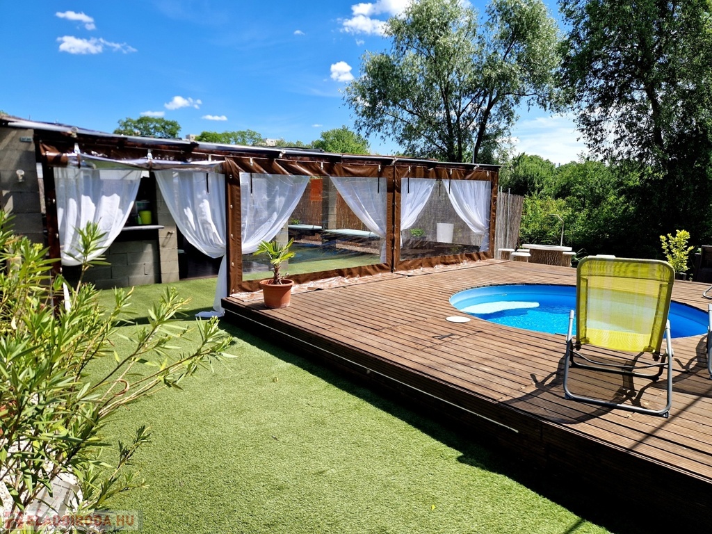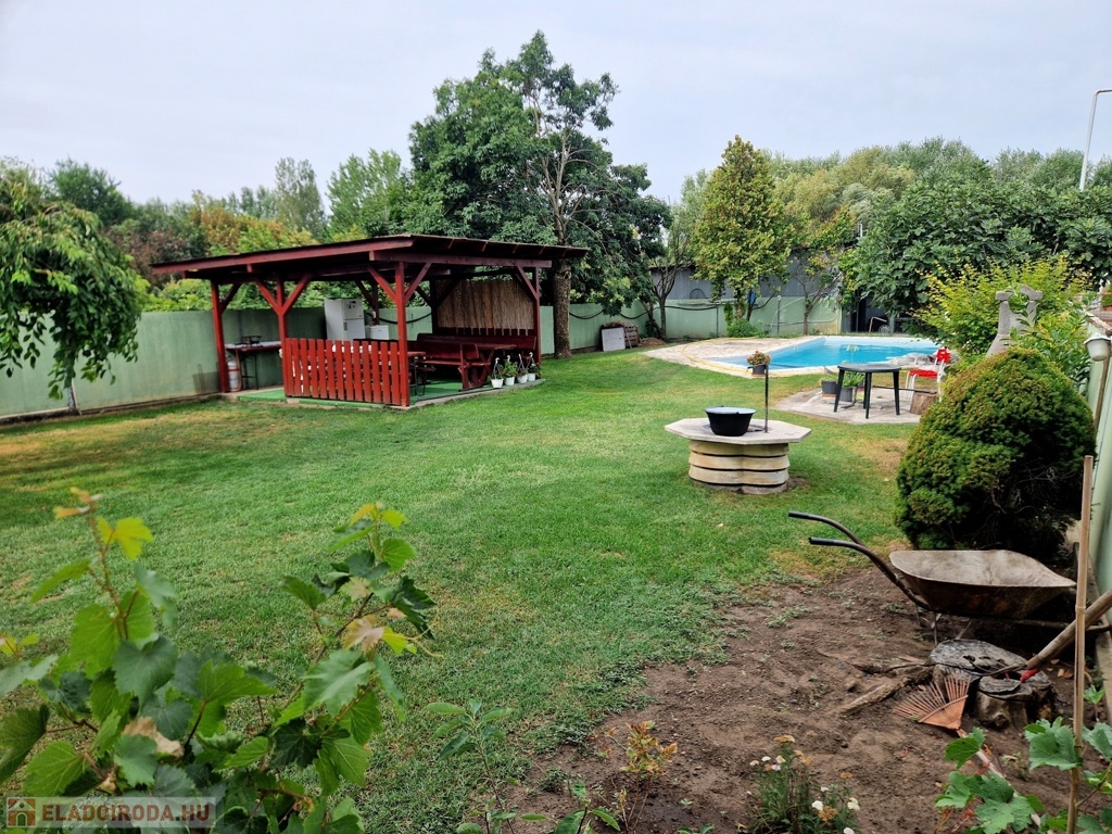 Továbbá az ingatlan területén 2 különálló, gondozott kert is található ahol: hangulatos filagória és medence wellness részleggel biztosítja a pihenést, egy természetes halastó: 20m × 10 méteres vízfelülettel várja a kikapcsolódásra vágyókat.
