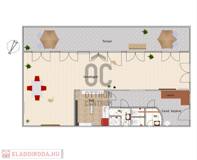 Az épületbe a teraszon keresztül jutunk be, az ajtón belépve tágas tér fogad minket, melyből a pult, a vendégmosdók, illetve a hátsó gazdasági bejárat is könnyen elérhető. Az ideális elhelyezkedésű ablakoknak köszönhetően mindenhol biztosított a világos ,kellemes hangulatú tér.