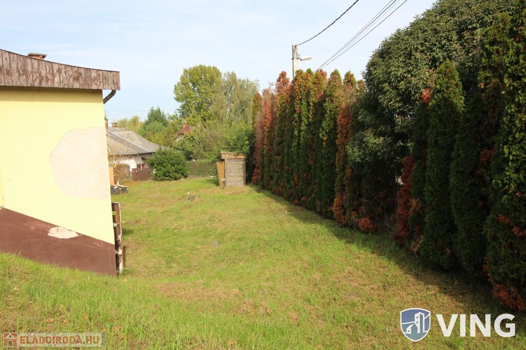 A telek 808 nm, füvesített, tujákkal szegélyezve, teljesen körbe kerítve.