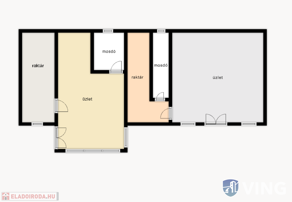 A jelenleg működő üzletrész 80 nm + pince 60 nm. A félkész épület 100 nm + alatta 2 állásos garázs, valamint pince, kazánház, háztartási helyiség.