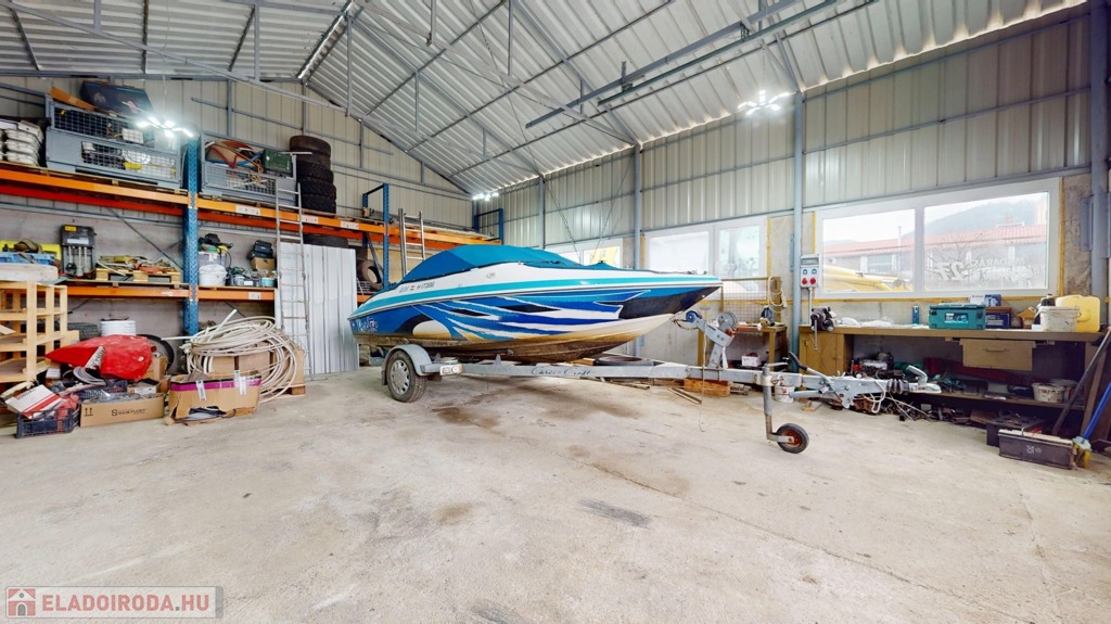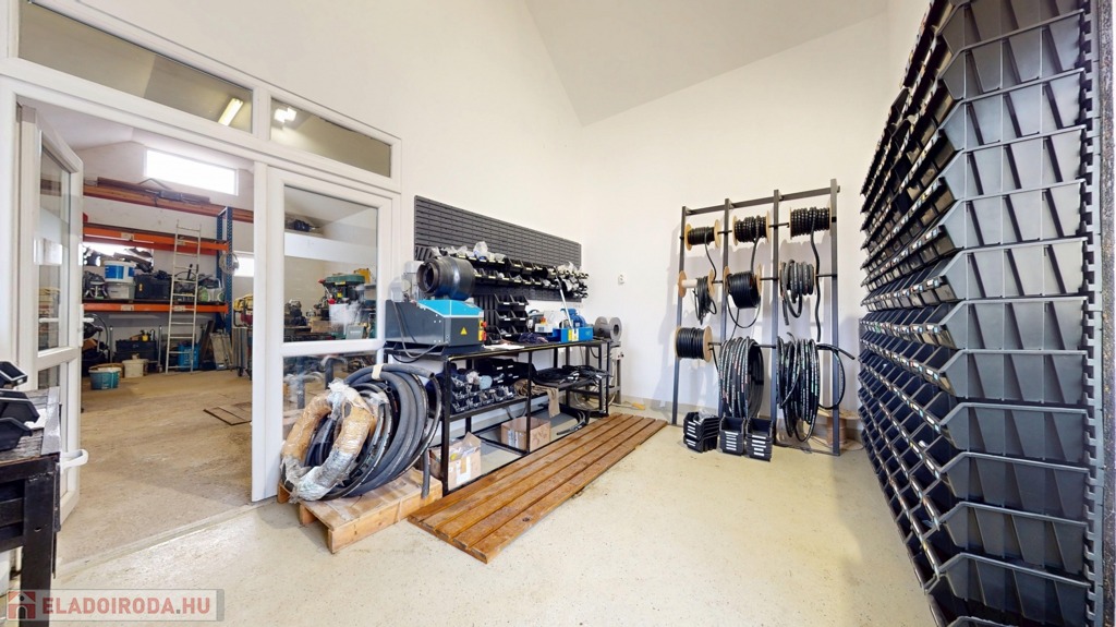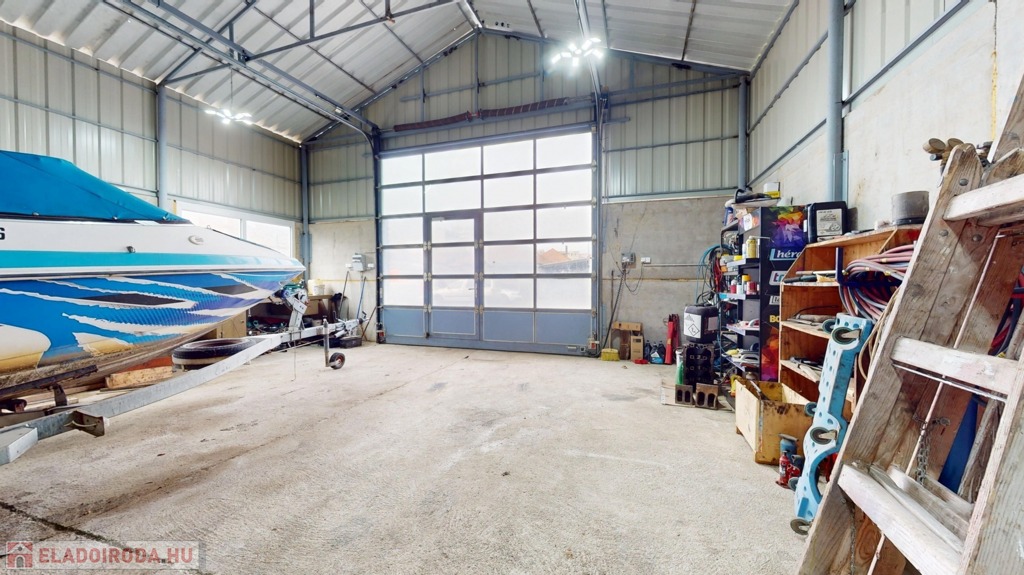 Külön található egy könnyűszerkezetes műhely, kb. 5 méteres belmagassággal, ami ritka és rendkívül sok lehetőséget kínál (autószerelés, gyártás, raktározás stb.).