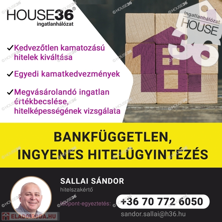 Figyelem az adatlap megbízóinktól kapott adatok alapján készült, pontosságáért felelősséget nem tudunk vállalni!Amennyiben a hirdetés felkeltette érdeklődését, illetve eladó, vagy kiadó ingatlana van, forduljon hozzám bizalommal. Szolgáltatásaink kereső ügyfeleink részére díjmentesek!A tulajdonos kérésére az ingatlan bemutatása egy személyes konzultáció után történik, ahol részletes tájékoztatást kaphat az ingatlan paramétereiről és dokumentációjáról.