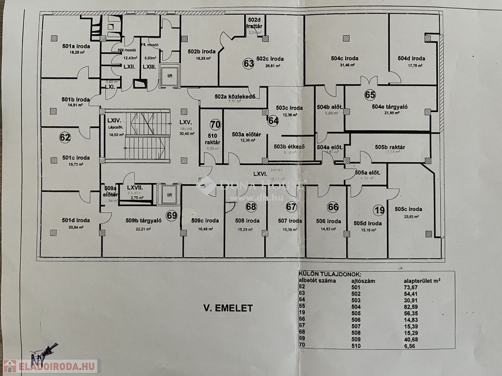 A jelen hirdetés a 74 m2-es, 4 helyiségből álló irodára vonatkozik, melyet az emelet rajzon 62-as számmal jelölünk. Az iroda napfényes, nagyon világos, panorámás, bútorozott és légkondicionált.