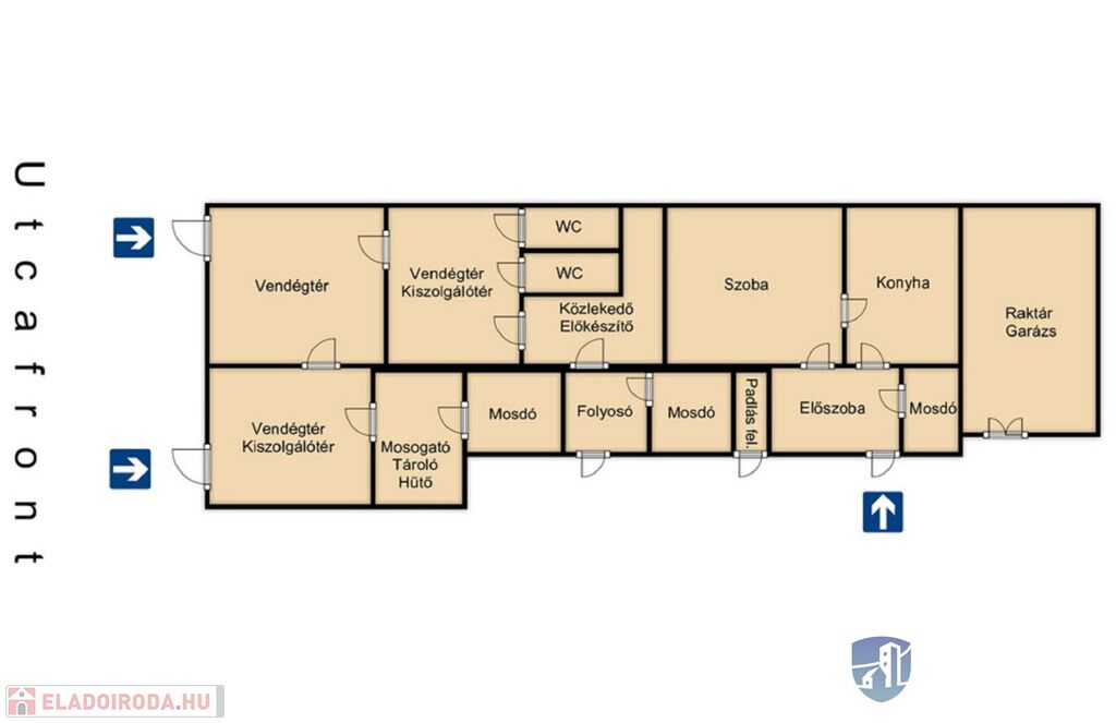 Kialakításának köszönhetően az üzlethelyiségek külön és egyben is használhatóak. Korábban pékségként üzemelt, de vendéglátó egységnek is alkalmas. Rendelkezik külön mosdóval és hűtőkamrával is.