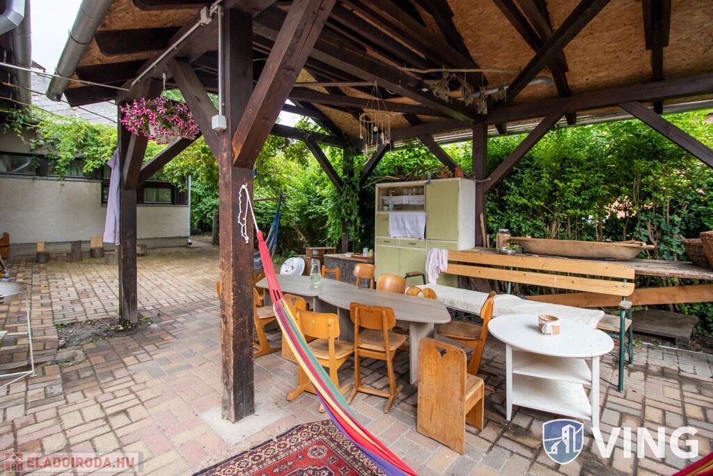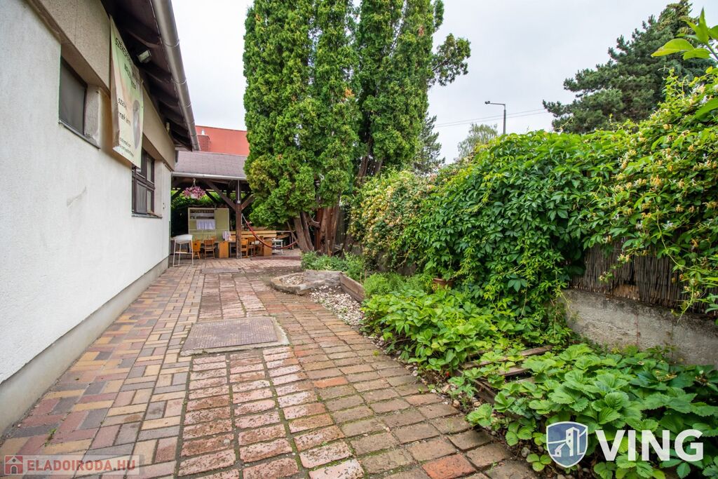 A ház mellett térkövezett, fedett terasz is található. A rendezett udvaron szintén térkövezett járdákon lehet közlekedni. A ház előtt 3 autó parkolására alkalmas, saját parkoló található.